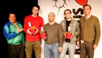 Jürgen K.W. Timm (zweiter von links) und Karl Gschaider (zweiter von rechts), die Preisträger 2000 mit Martin Kosch, Hutter und Radl aus Wien, Helmut Schleich und Christian Springer